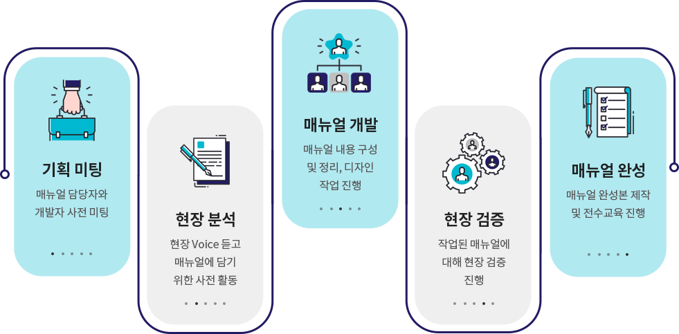 매뉴얼 활용 목적에 따른 내용 구성 및 디자인으로 현업에 필요한 가이드를 제공할 수 있도록 매뉴얼을 완성합니다