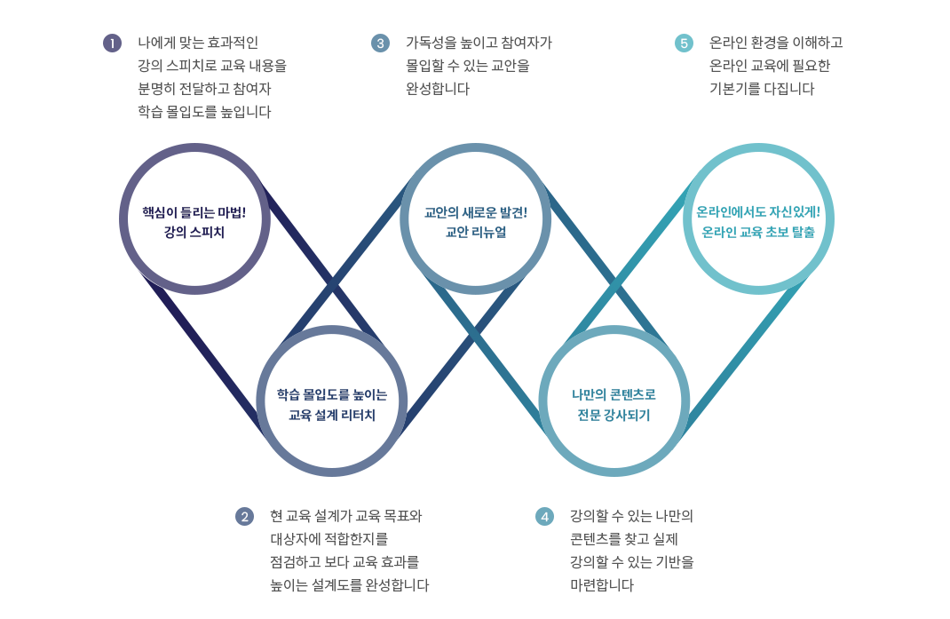 온라인에서도 자신있게! 온라인 교육 초보 탈출(8시간) 온라인 교육 이해 및 트렌드 점검 온라인 교육을 위한 자가점검 온라인 교육 환경 이해 및 프로그램 기능 실습 온라인 교육과정 설계와 커뮤니케이션(스피치) 온라인에서 가능한 참여형 교수방법 실습 온라인 교육 시범 강의 후 피드백